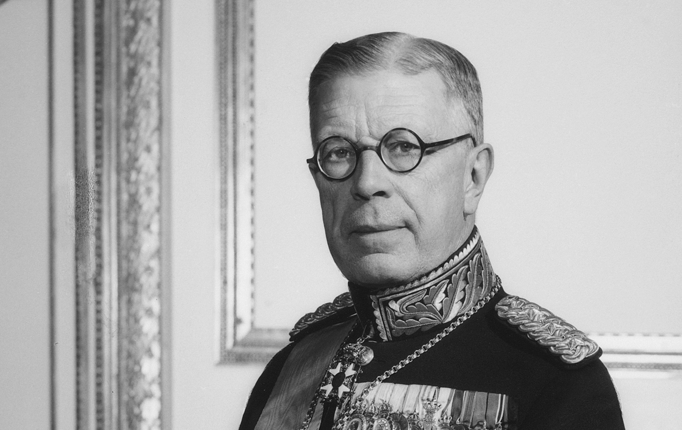 Porträtt av Gustaf VI Adolf i uniform. Foto från 1951. Detta är bortadopterade pojkens riktiga far. Det är nuvarande kungens farfar.
